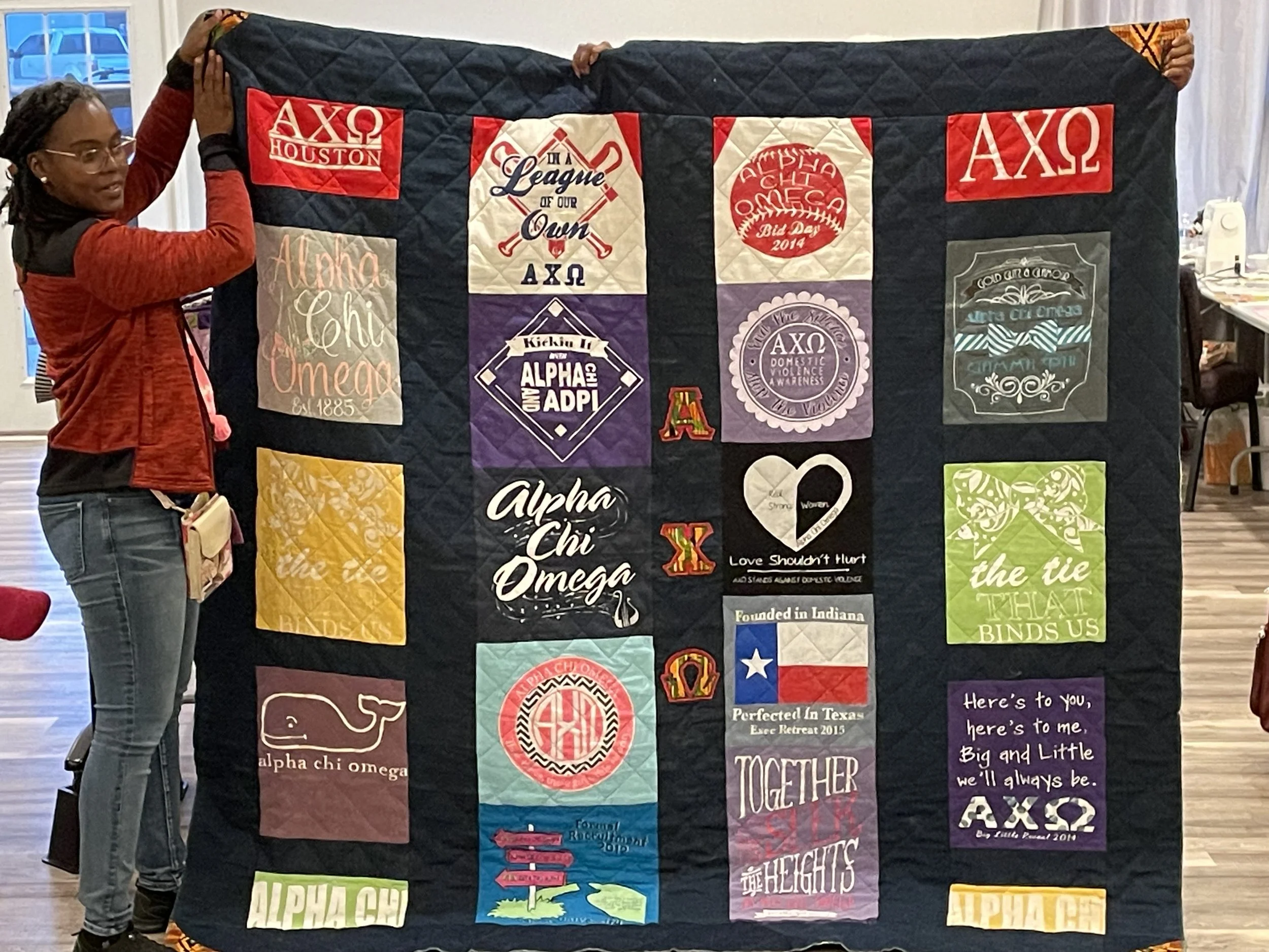 Memory Quilts, or other quilted items, are custom-made using clothing, t-shirt logos, or other woven memorabilia. Each quilt tells a unique story, making it a meaningful keepsake.